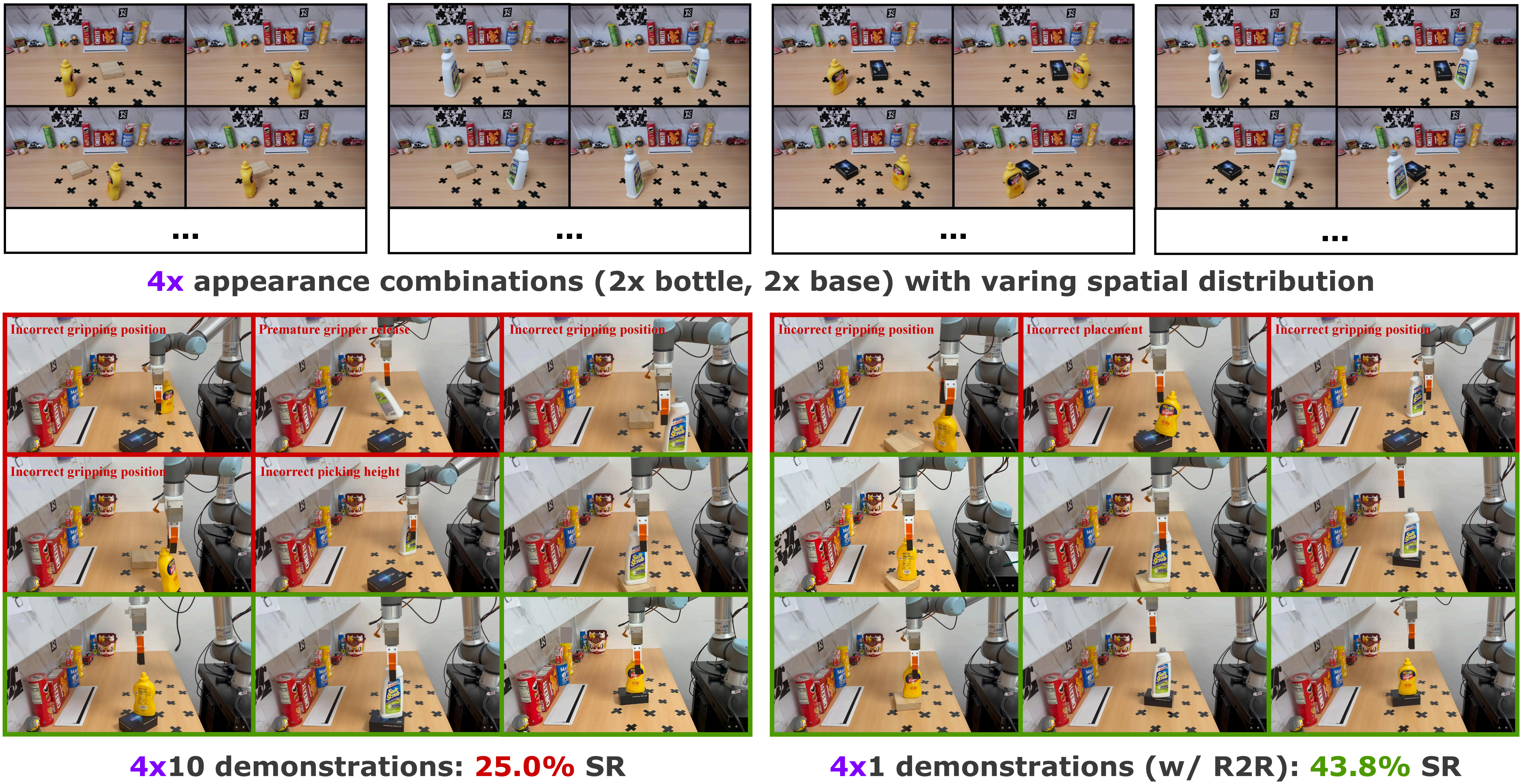 Beyond spatial generalization, robotic manipulation tasks involve other forms of generalization, such as appearance generalization (i.e., adapting to novel object instances and environments) and task generalization. Among these, spatial generalization serves as the fundamental prerequisite for other generalization capabilities. Since this work focuses on single-task visuomotor policy learning, we investigate whether the spatial generalization enabled by R2RGen can further facilitate appearance generalization. As shown in figure below, we design a more challenging Place-Bottle task with four distinct bottle-base appearance combinations (2 bottle types x 2 base types). We observe that achieving both appearance and spatial generalization significantly increases data demand. Even with 40 human demonstrations (10 per bottle-base pair), the policy only reaches a 25% success rate. In contrast, using R2RGen, only 1 demonstration per bottle-base pair (4 in total) is needed to achieve a success rate of 43.8%, demonstrating its efficiency in handling combined generalization challenges.