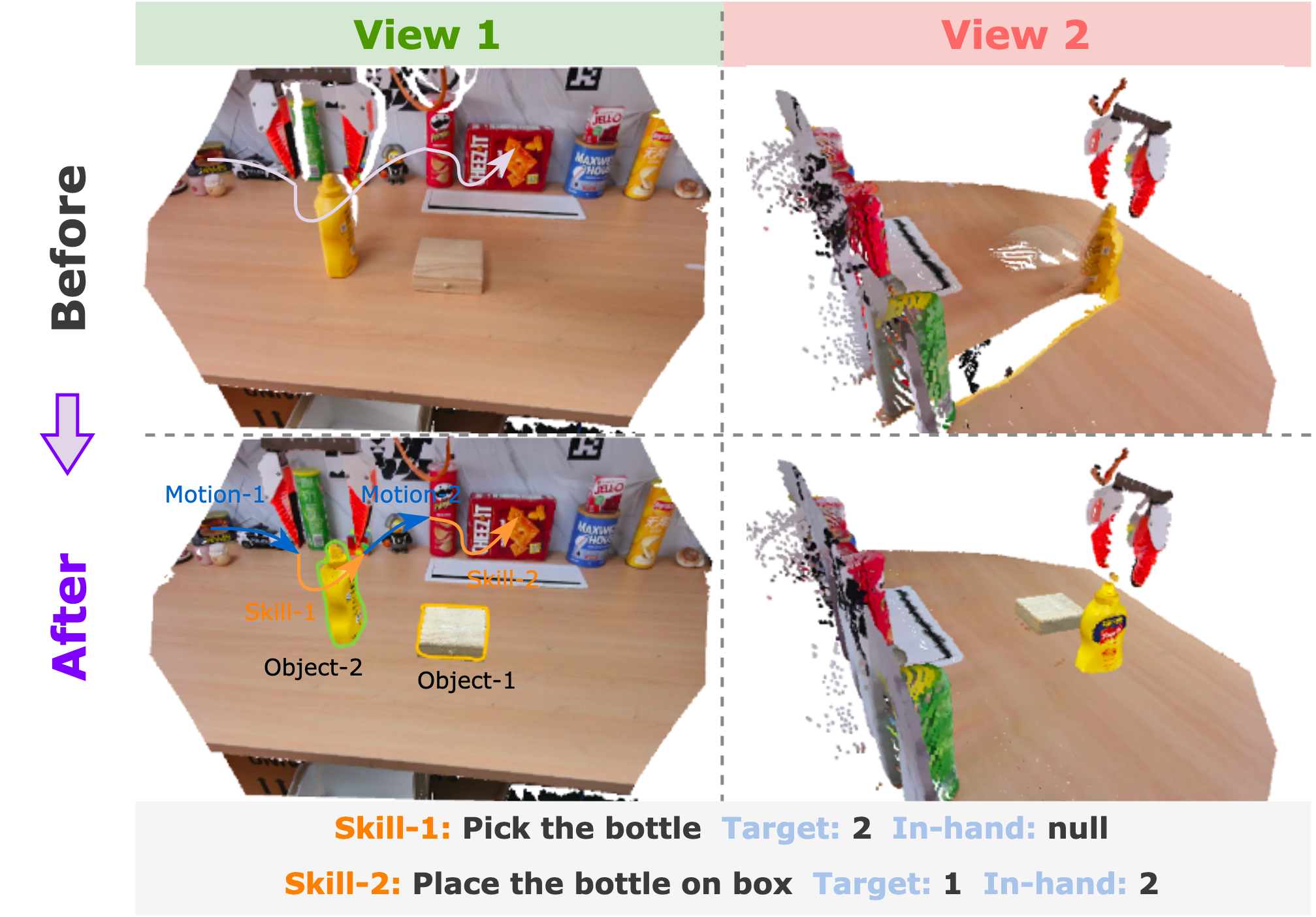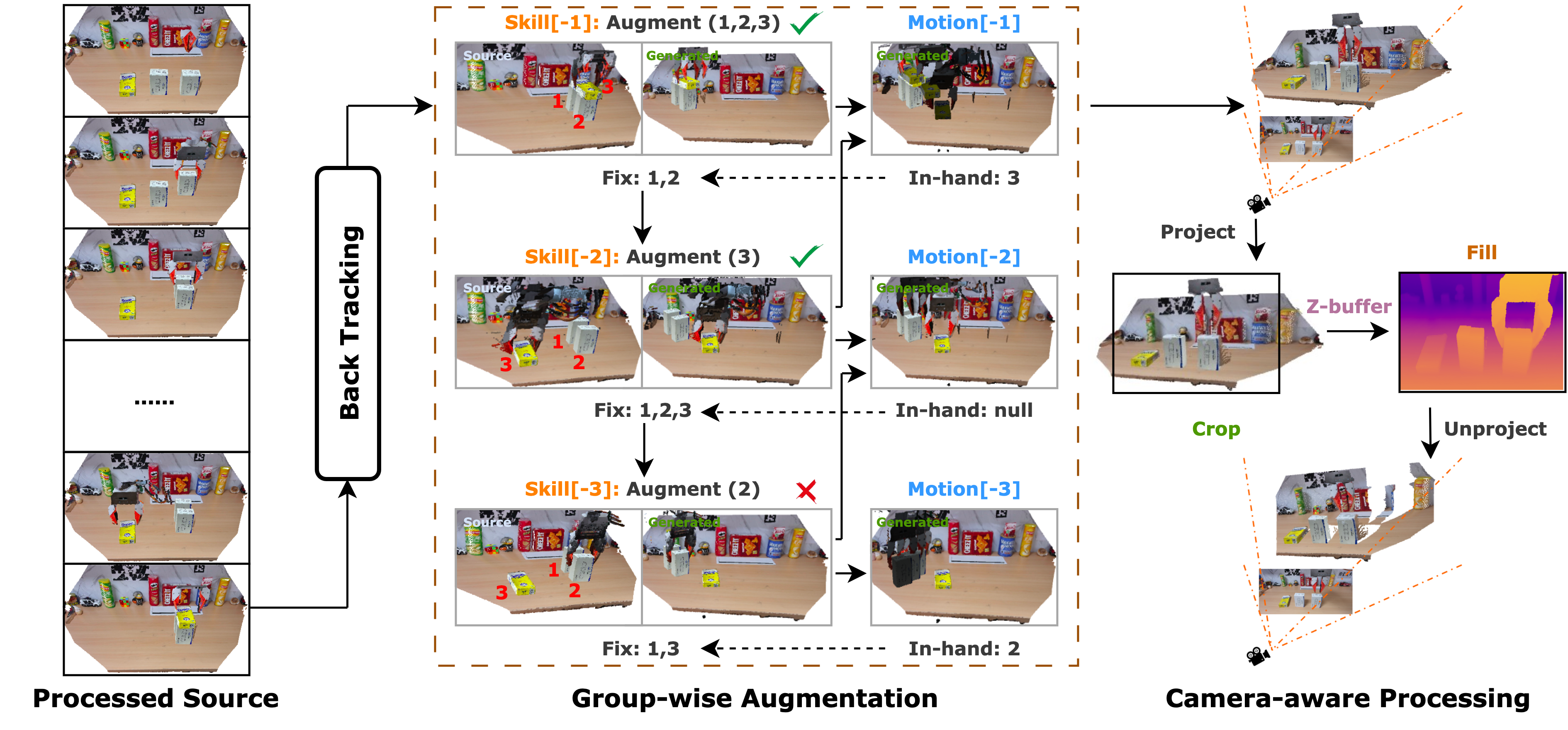 Pre-processing. We design an annotation system with shape-aware source pre-processing. After processing, the 3D scene is parsed into complete objects, environment and robot’s arm. The trajectory is parsed into interleaved motion and skill segments. Pipeline of R2RGen. Given processed source demonstration, we backtrack skills and apply group-wise augmentation to maintain the spatial relationships among target objects, where a fixed object set is maintained to judge whether the augmentation is applicable. Then motion planning is performed to generate trajectories that connect adjacent skills. After augmentation, we perform camera-aware processing to make the pointclouds follow distribution of RGB-D camera. The solid arrows indicate the processing flow, while the dashed arrows indicate the updating of fixed object set.