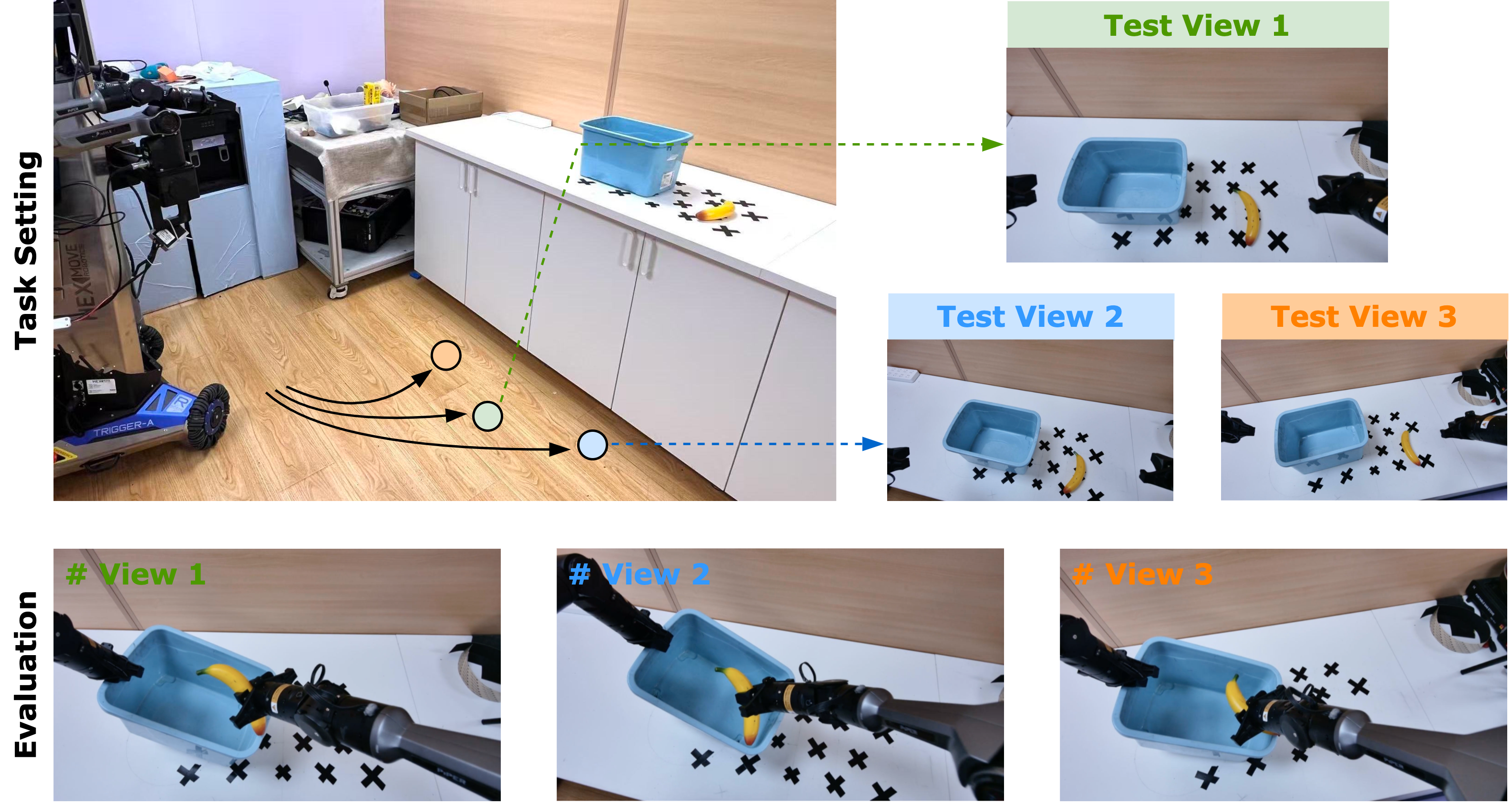 R2RGen makes our 3D policy achieve strong spatial generalization across different viewpoints without camera calibration, so we can achieve mobile manipulation by simply combining a navigation system and a manipulation policy trained with R2RGen. Since the termination condition of navigation is relatively loose, the robot may stop at different docking point around the manipulation area, which imposes great challenges on the manipulation policy.