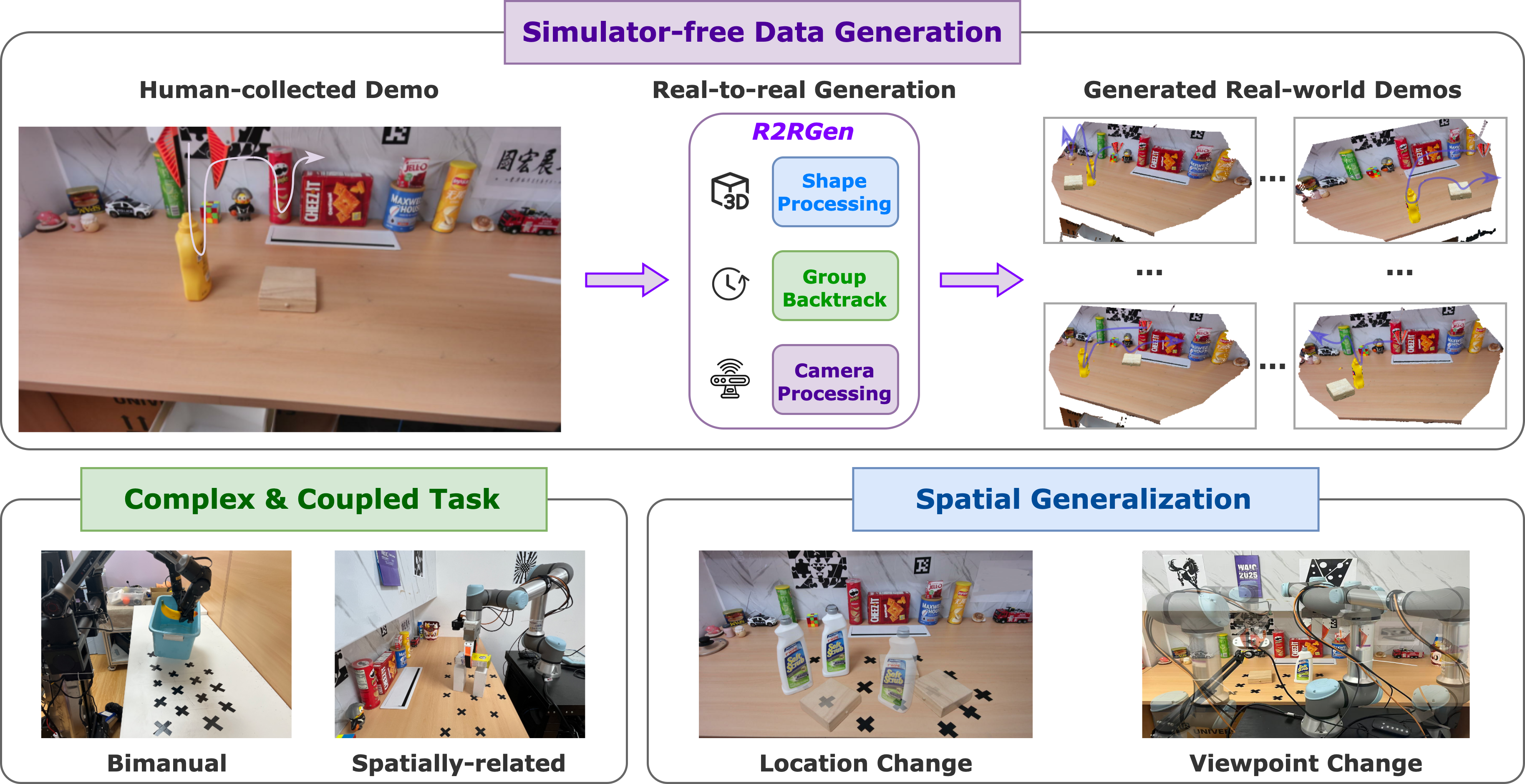 R2RGen generates spatially diverse manipulation demonstrations for training real-world policies, requiring only one human demonstration without simulator setup. Results: 1human demo + R2RGen > 25 human demos!